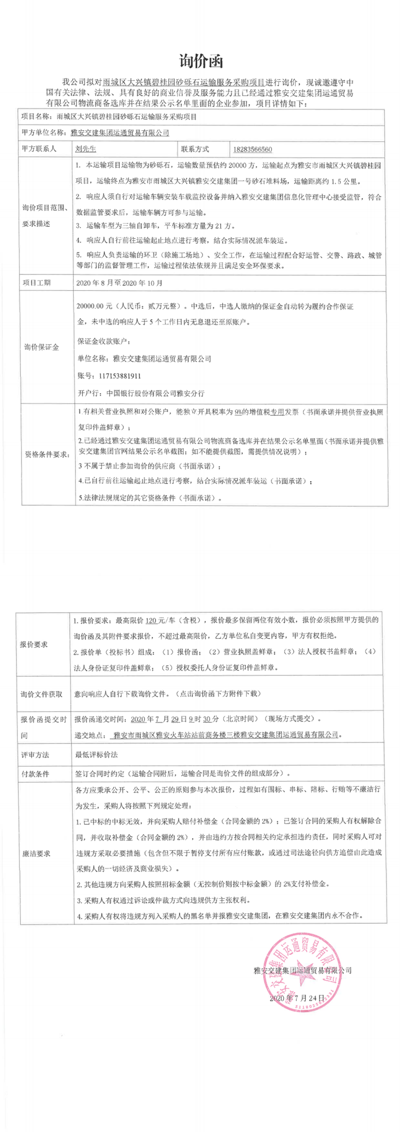 雅安交建集團運通貿(mào)易有限公司雨城區(qū)大興鎮(zhèn)碧桂園砂礫石運輸服務(wù)采購項目詢價函