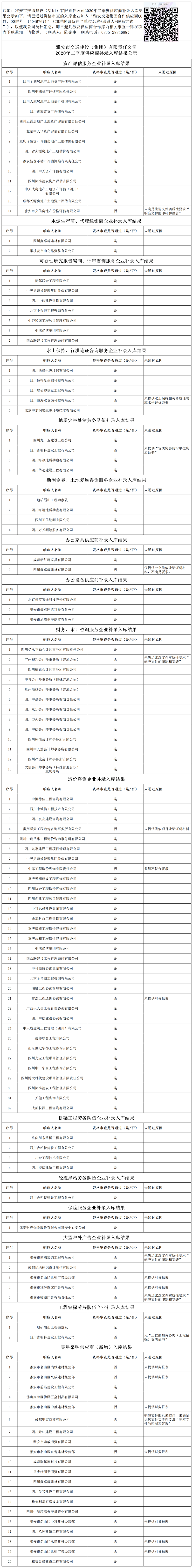 雅安市交通建設(shè)(集團)有限責任公司2020年二季度供應(yīng)商補錄入庫結(jié)果公示