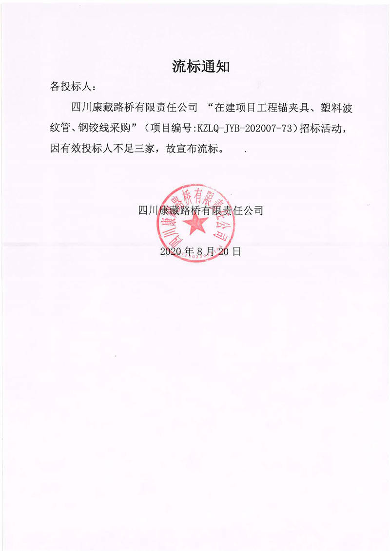 四川康藏路橋有限責(zé)任公司在建項(xiàng)目工程錨夾具、塑料波紋管、鋼鉸線采購(gòu)流標(biāo)通知