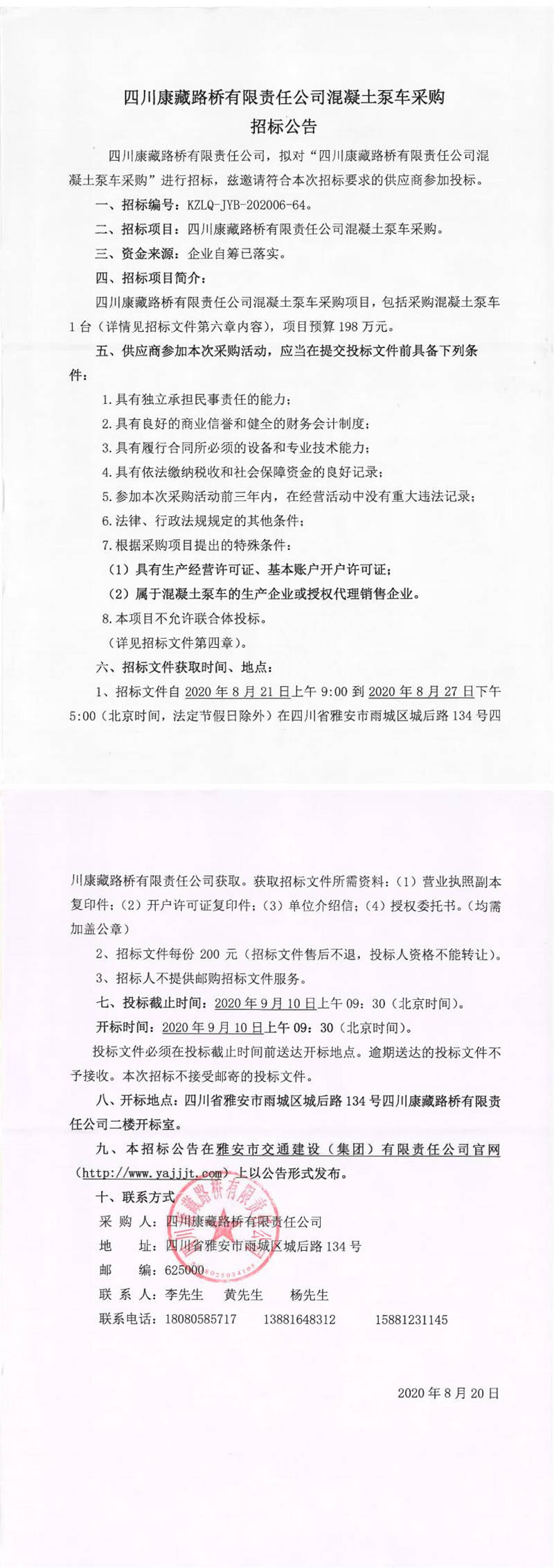 四川康藏路橋有限責(zé)任公司混凝土泵車(chē)采購(gòu)招標(biāo)公告