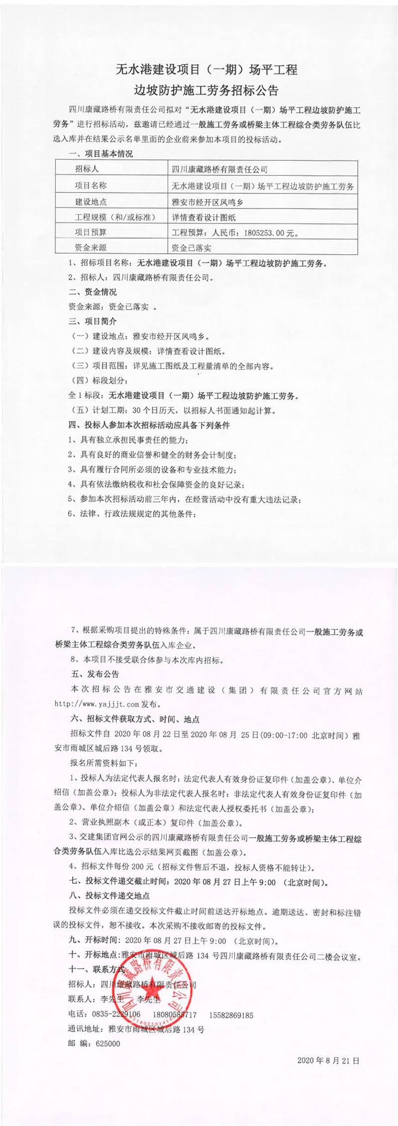 四川康藏路橋有限責(zé)任公司無水港建設(shè)項目(一期)場平工程邊坡防護(hù)施工勞務(wù)招標(biāo)公告