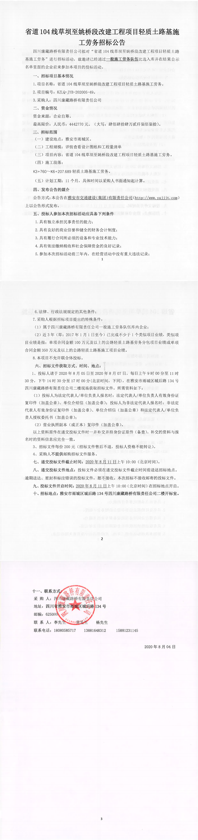四川康藏路橋有限責(zé)任公司省道104線草壩至姚橋段改建工程項目輕質(zhì)土路基施工勞務(wù)招標公告