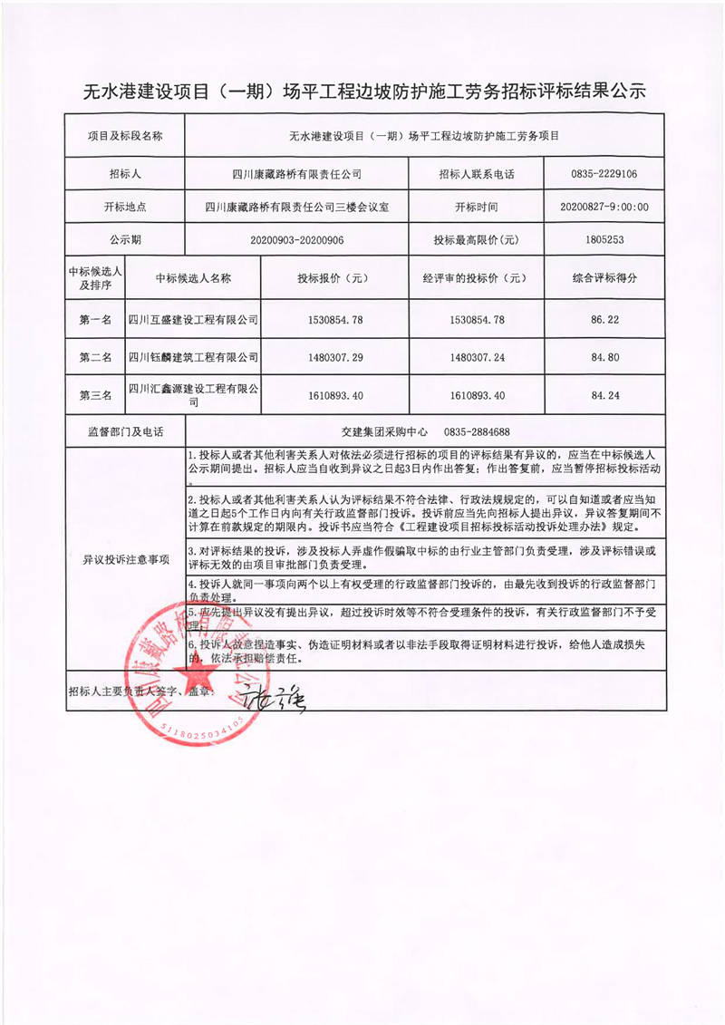 四川康藏路橋有限責任公司無水港建設項目(一期)場平工程邊坡防護施工勞務招標評標結果公示