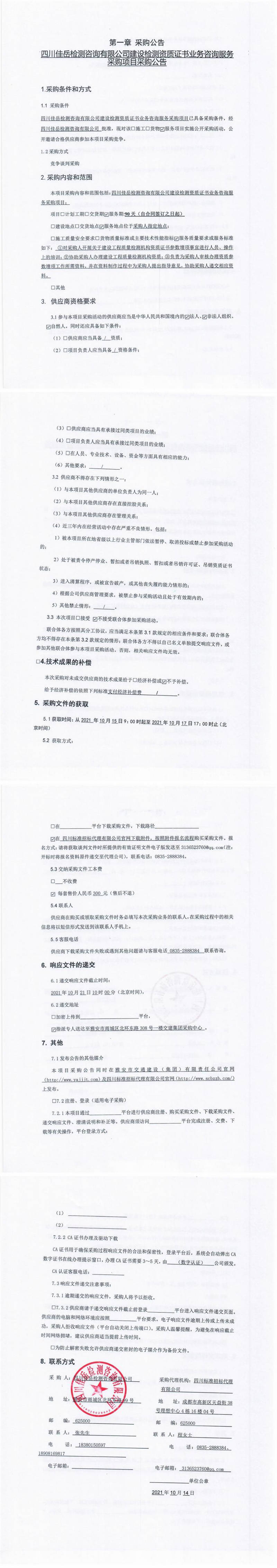 四川佳岳檢測咨詢有限公司建設檢測資質證書業(yè)務咨詢服務采購項目采購公告