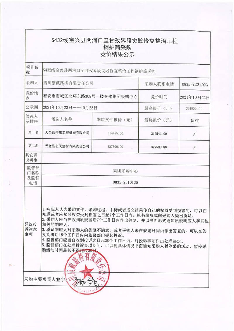四川康藏路橋有限責(zé)任公司S432線寶興縣兩河口至甘孜界段災(zāi)毀修復(fù)整治工程鋼護(hù)筒采購競價(jià)結(jié)果公示