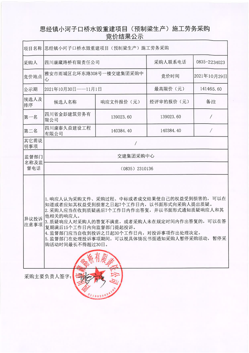 四川康藏路橋有限責(zé)任公司思經(jīng)鎮(zhèn)小河子口橋水毀重建項目(預(yù)制梁生產(chǎn))施工勞務(wù)采購競價結(jié)果公示