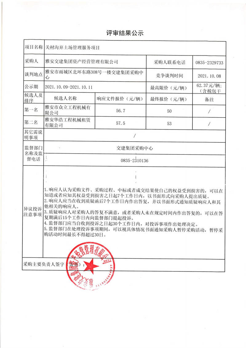 雅安交建集團(tuán)資產(chǎn)經(jīng)營(yíng)管理有限公司關(guān)材溝棄土場(chǎng)管理服務(wù)項(xiàng)目評(píng)審結(jié)果公示