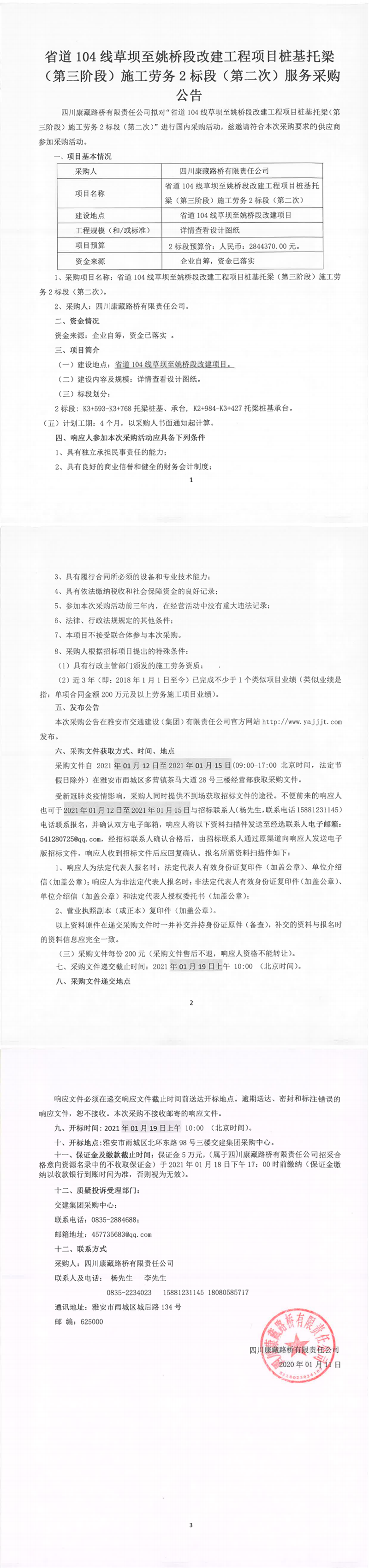 四川康藏路橋有限公司省道104線草壩至姚橋段改建工程項目樁基托梁(第三階段)施工勞務(wù)2標(biāo)段(第二次)服務(wù)采購公告