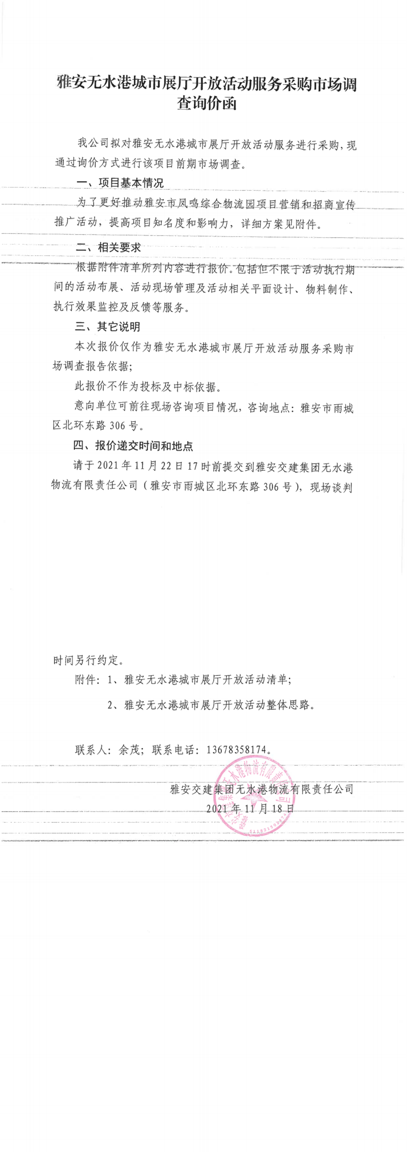 雅安交建集團(tuán)無水港物流有限責(zé)任公司雅安無水港城市展廳開放活動(dòng)服務(wù)采購市場(chǎng)調(diào)查詢價(jià)函