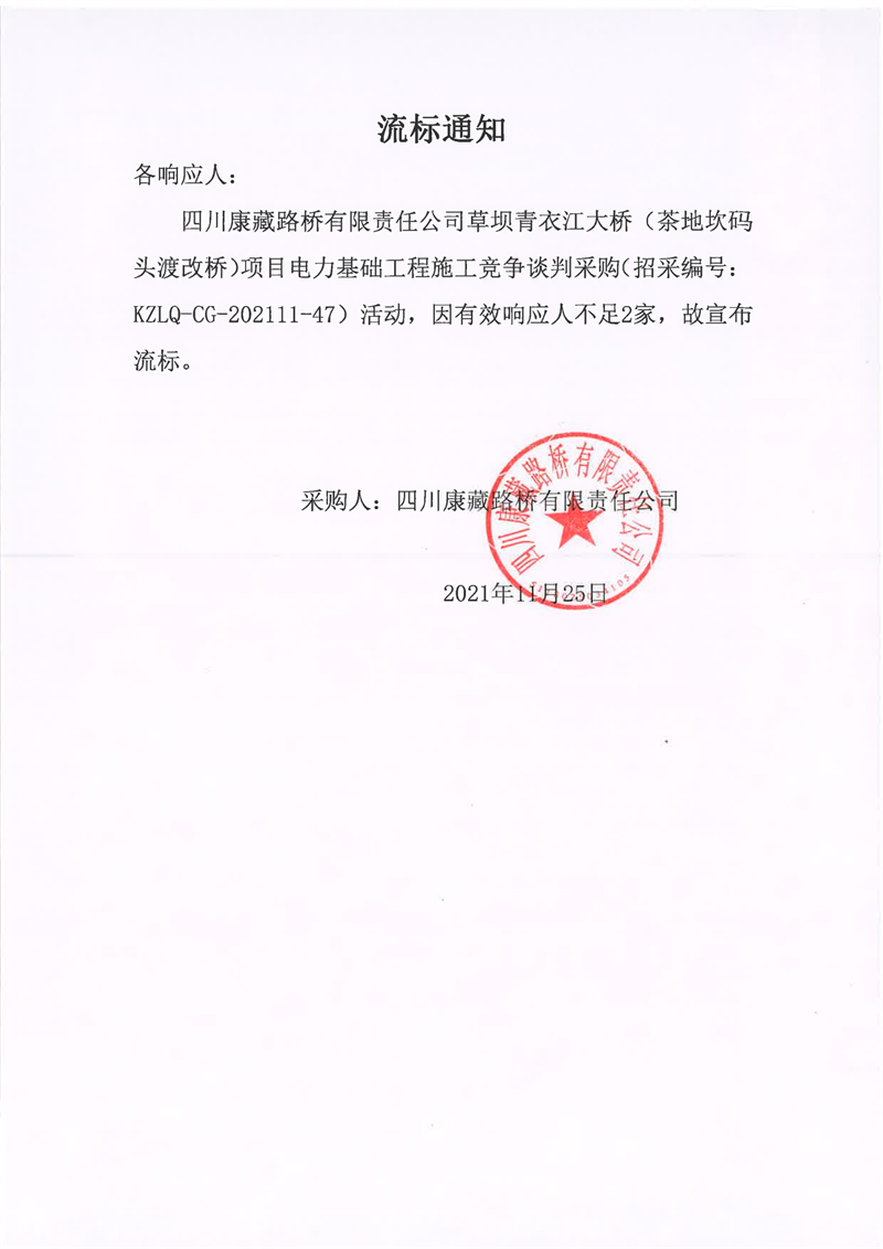 四川康藏路橋有限責(zé)任公司草壩青衣江大橋(茶地坎碼頭渡改橋)項目電力基礎(chǔ)工程施工競爭談判采購流標(biāo)通知
