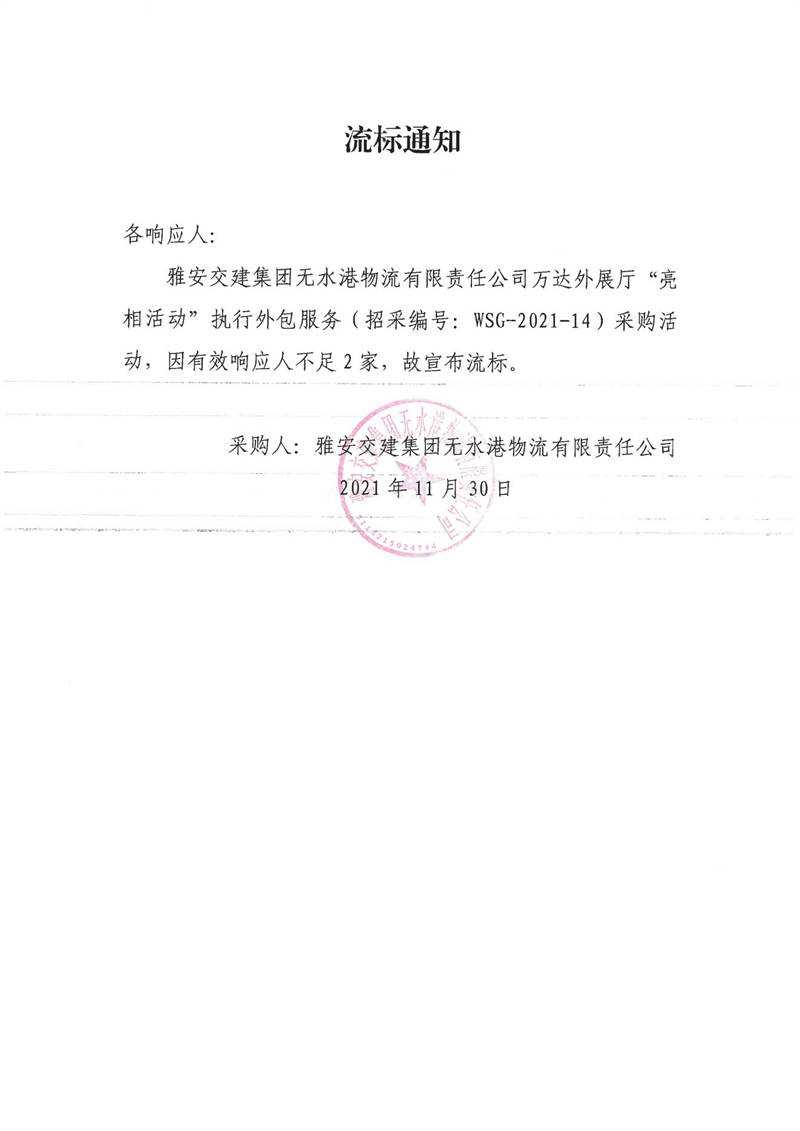 雅安交建集團無水港物流有限責(zé)任公司萬達外展廳“亮相活動”執(zhí)行外包服務(wù)流標(biāo)通知