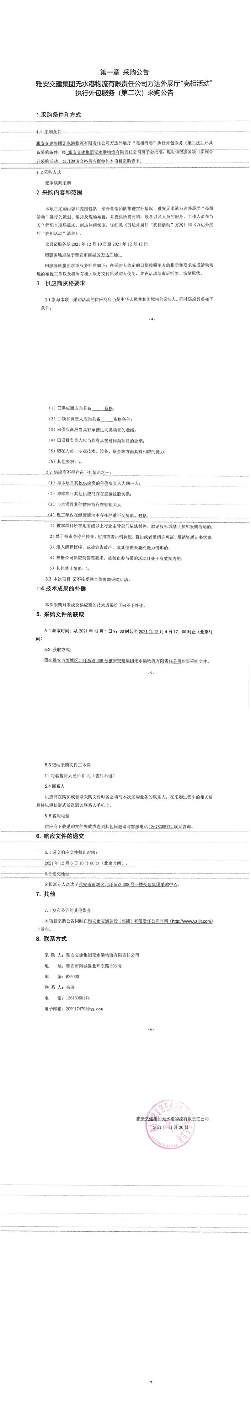 雅安交建集團(tuán)無水港物流有限責(zé)任公司萬達(dá)外展廳“亮相活動”執(zhí)行外包服務(wù)(第二次)采購公告
