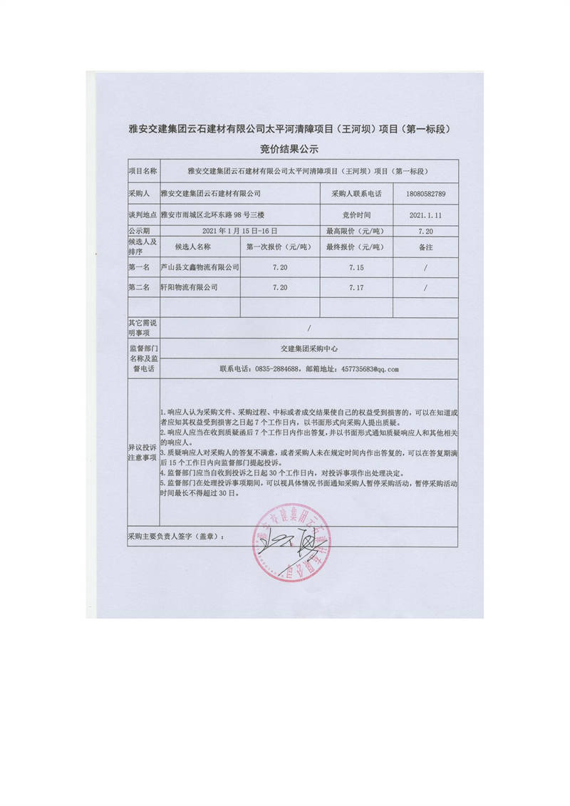 雅安交建集團(tuán)云石建材有限公司太平河清障項(xiàng)目(王河壩)項(xiàng)目(第一標(biāo)段)競(jìng)價(jià)結(jié)果公示