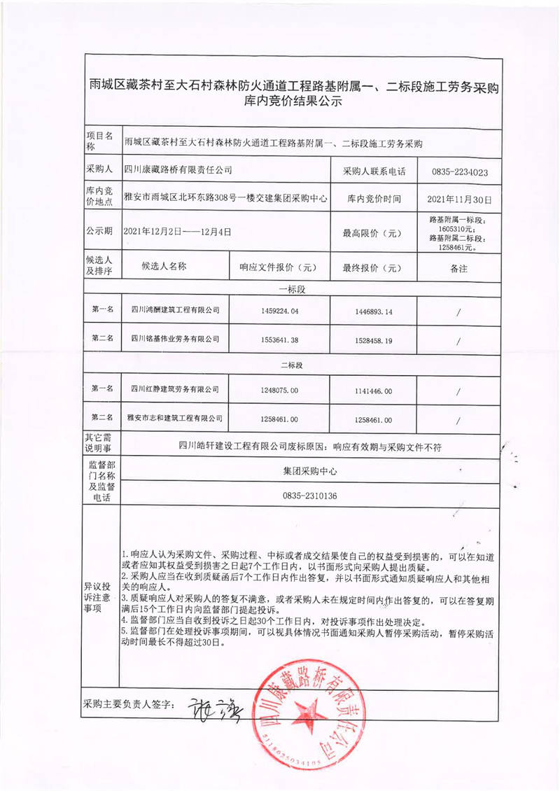 四川康藏路橋有限責任公司雨城區(qū)藏茶村至大石村森林防火通道工程路基附屬一、二標段施工勞務采購庫內(nèi)競價結果公示