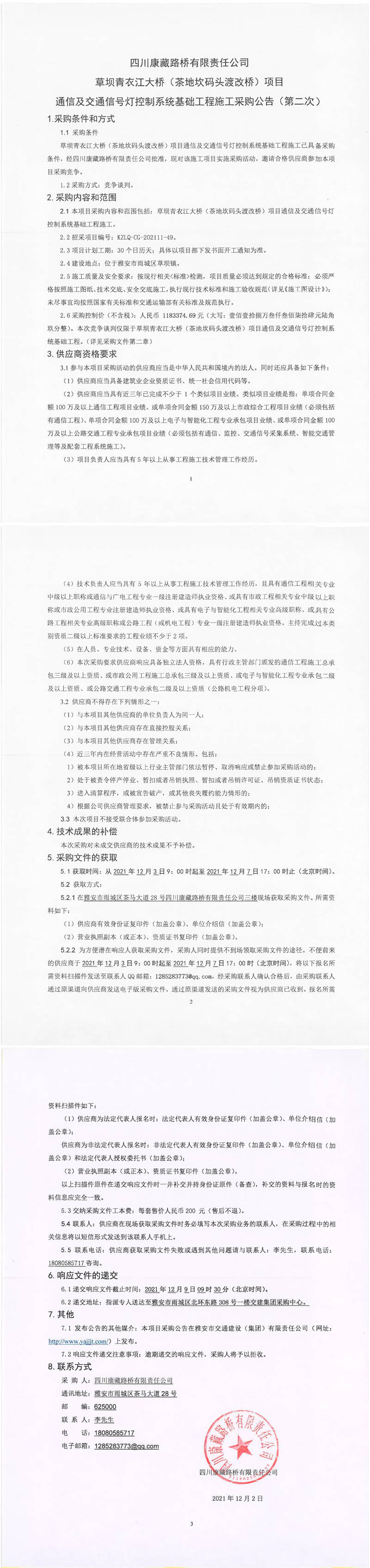 四川康藏路橋有限責(zé)任公司草壩青衣江大橋(茶地坎碼頭渡改橋)項目通信及交通信號燈控制系統(tǒng)基礎(chǔ)工程施工采購公告(第二次)