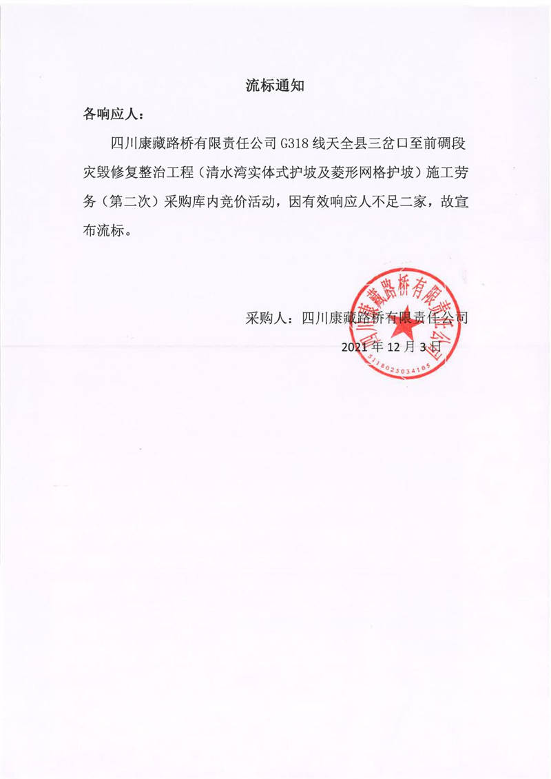 四川康藏路橋有限責任公司G318線天全縣三岔口至前碉段災(zāi)毀修復整治工程(清水灣實體式護坡及菱形網(wǎng)格護坡)施工勞務(wù)(第二次)采購流標通知