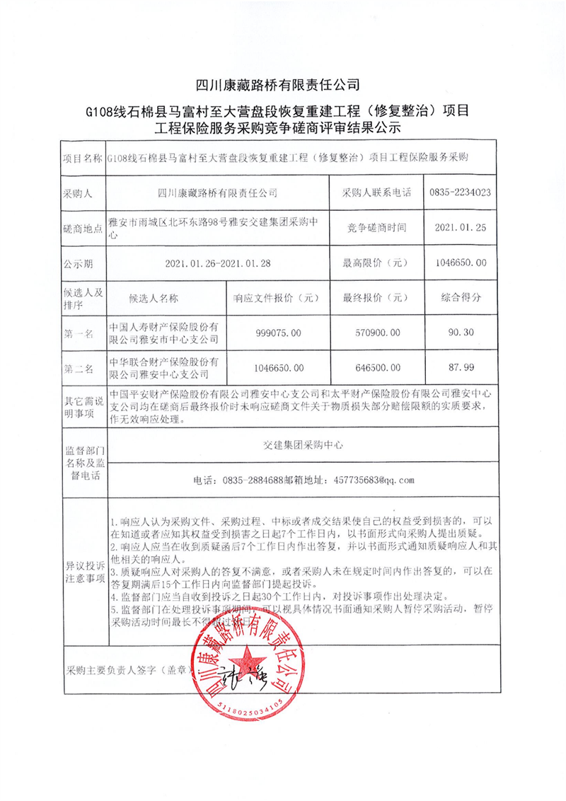 四川康藏路橋有限責任公司G108線石棉縣馬富村至大營盤段恢復重建工程(修復整治)項目工程保險服務采購競爭磋商評審結(jié)果公示