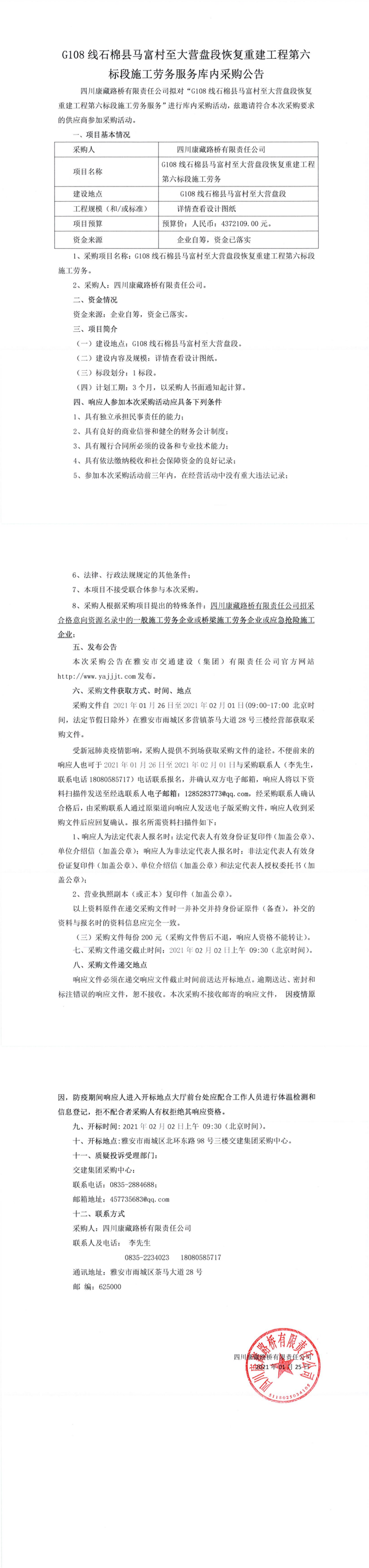 四川康藏路橋有限公司G108線石棉縣馬富村至大營盤段恢復(fù)重建工程第六標段施工勞務(wù)服務(wù)庫內(nèi)采購公告