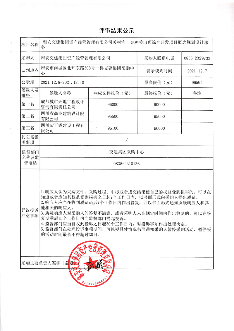 雅安交建集團資產(chǎn)經(jīng)營管理有限公司關(guān)材溝、金雞關(guān)山頂綜合開發(fā)項目概念規(guī)劃設計服務評審結(jié)果公示