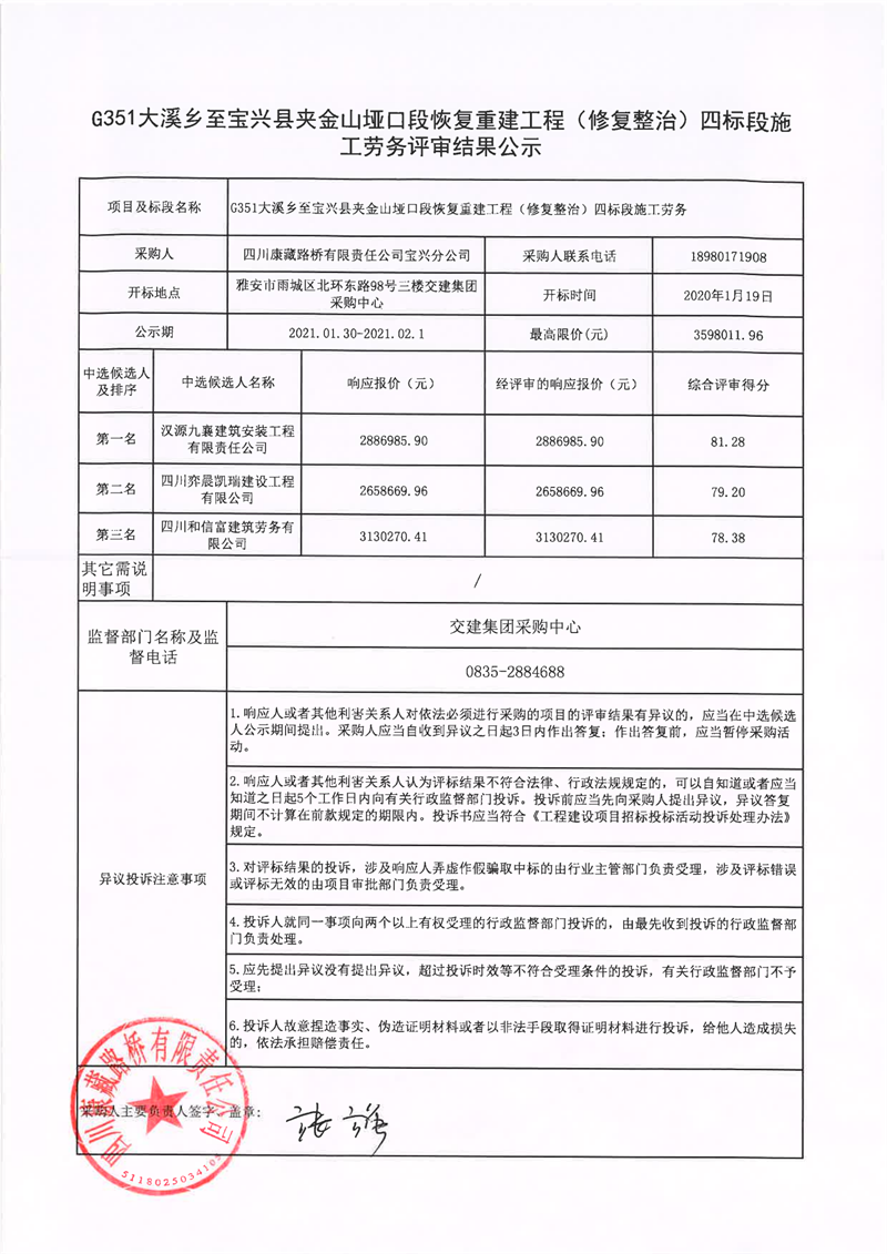 四川康藏路橋有限責任公司G351大溪鄉(xiāng)至寶興縣夾金山埡口段恢復重建工程(修復整治)四標段施工勞務評審結(jié)果公示