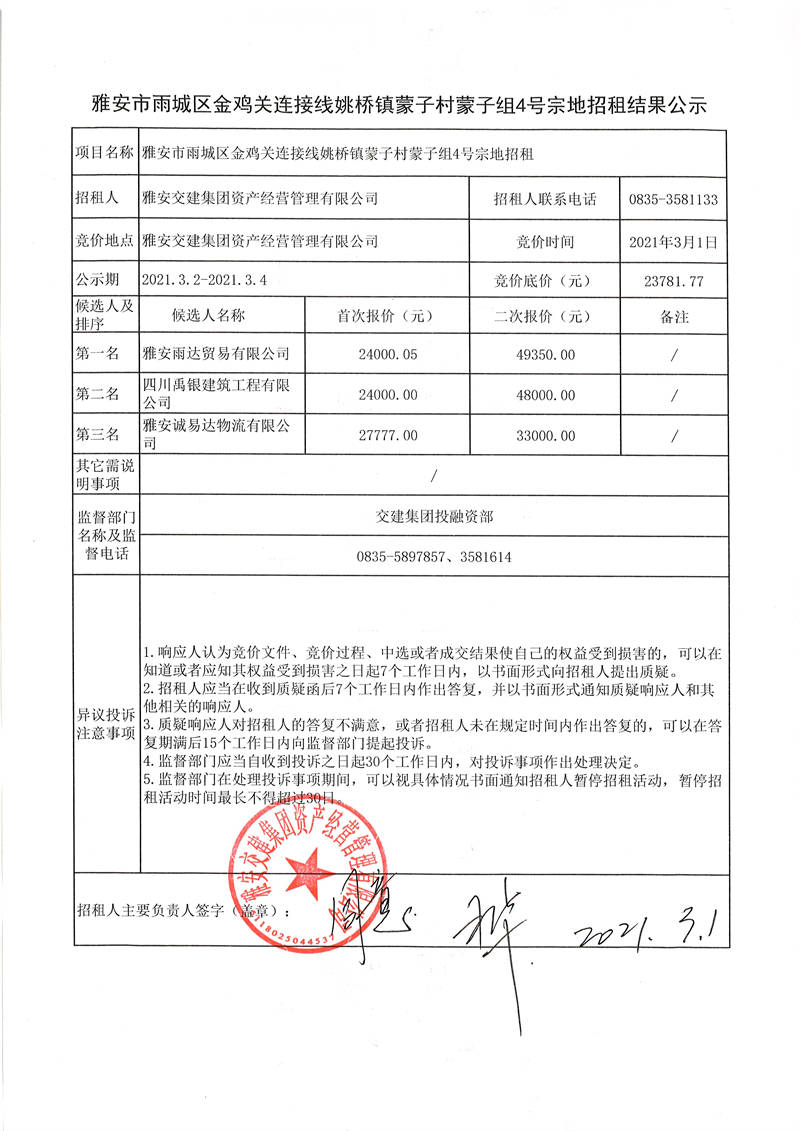 雅安交建集團資產(chǎn)經(jīng)營管理有限公司雅安市雨城區(qū)金雞關(guān)連接線姚橋鎮(zhèn)蒙子村蒙子組4號宗地招租結(jié)果公示