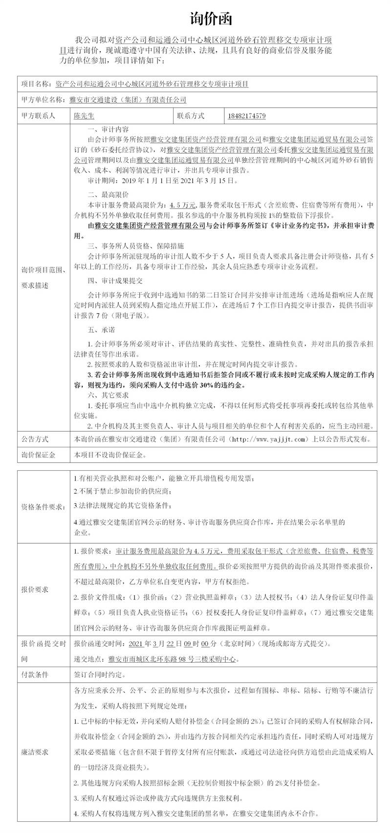 雅安市交通建設(shè)(集團(tuán))有限責(zé)任公司資產(chǎn)公司和運(yùn)通公司中心城區(qū)河道外砂石管理移交專項審計項目詢價函