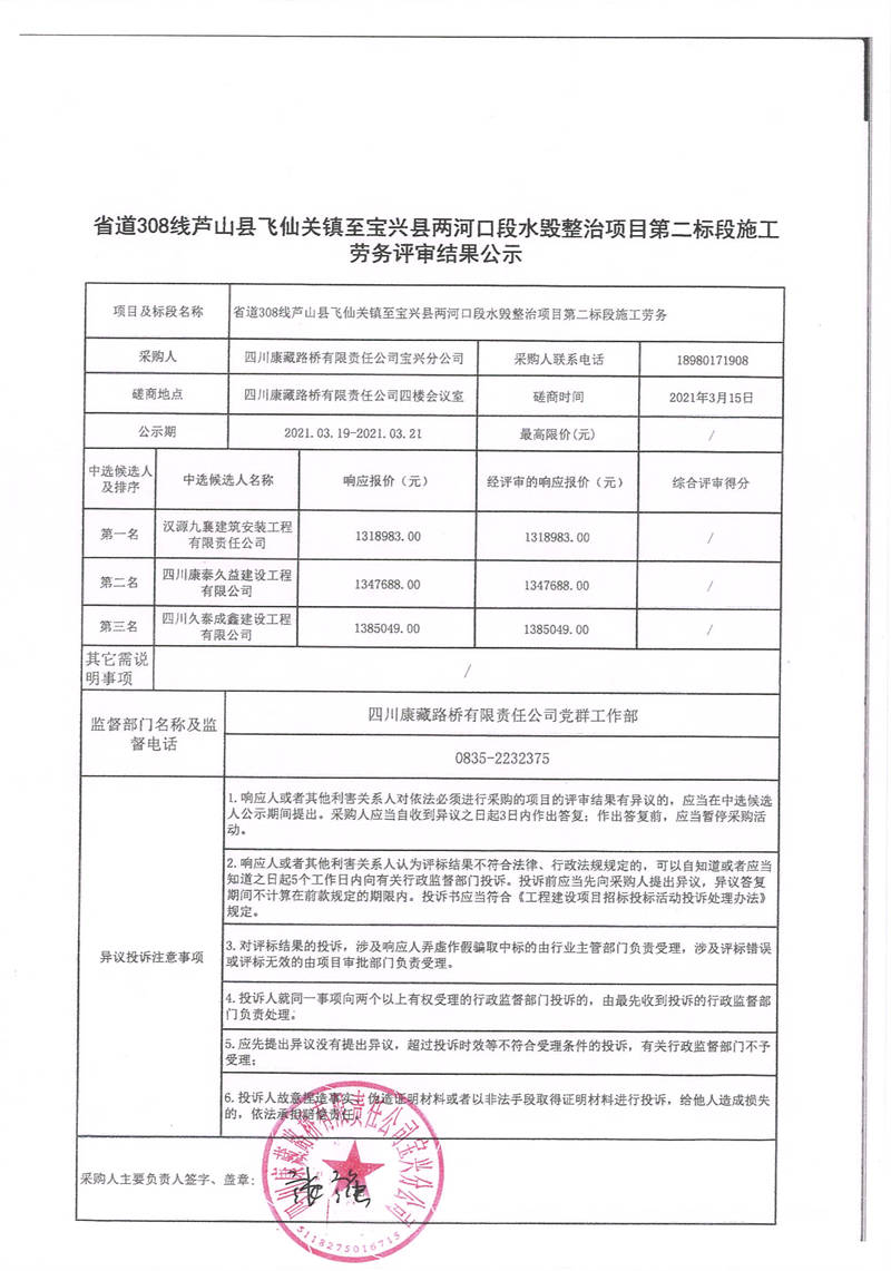 四川康藏路橋有限責(zé)任公司寶興分公司省道308線蘆山縣飛仙關(guān)鎮(zhèn)至寶興縣兩河口段水毀整治項目第二標(biāo)段施工勞務(wù)評審結(jié)果公示