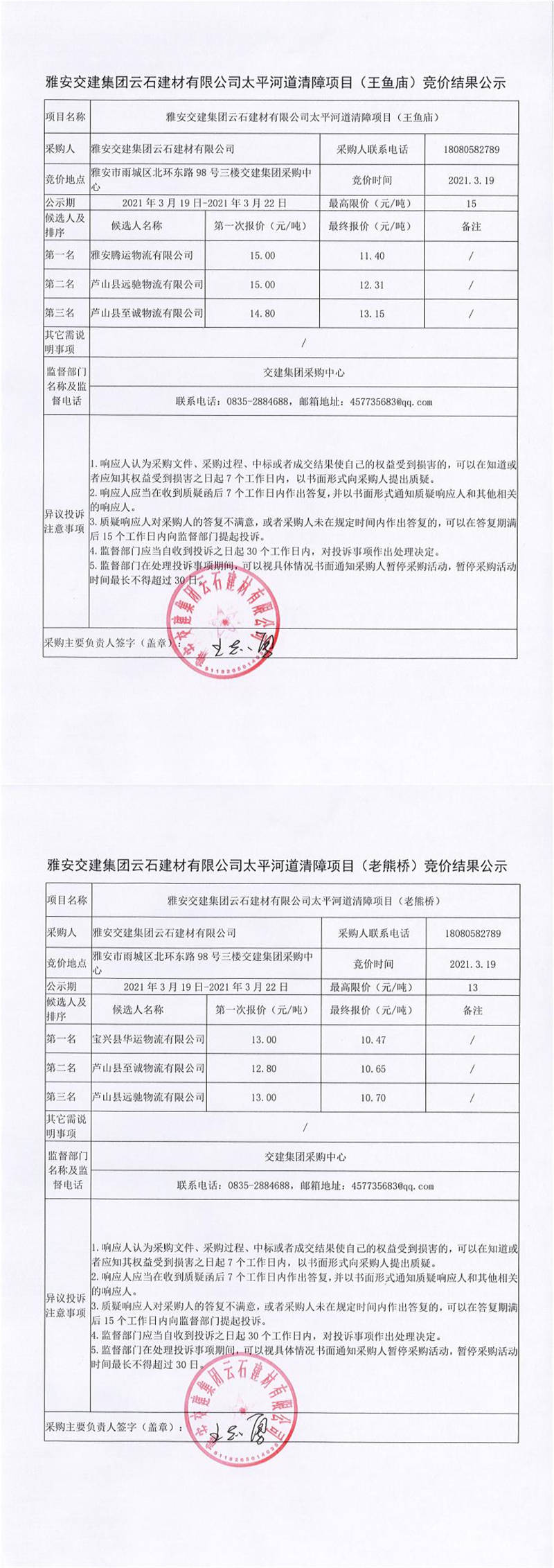 雅安交建集團云石建材有限公司太平河道清障項目競價結果公示