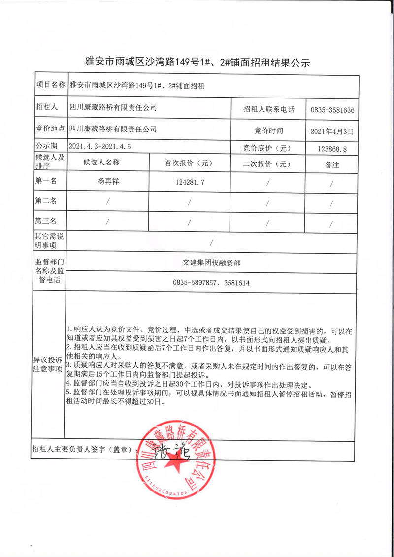 四川康藏路橋有限責(zé)任公司雅安市雨城區(qū)沙灣路149號(hào)1#、2#鋪面招租結(jié)果公示