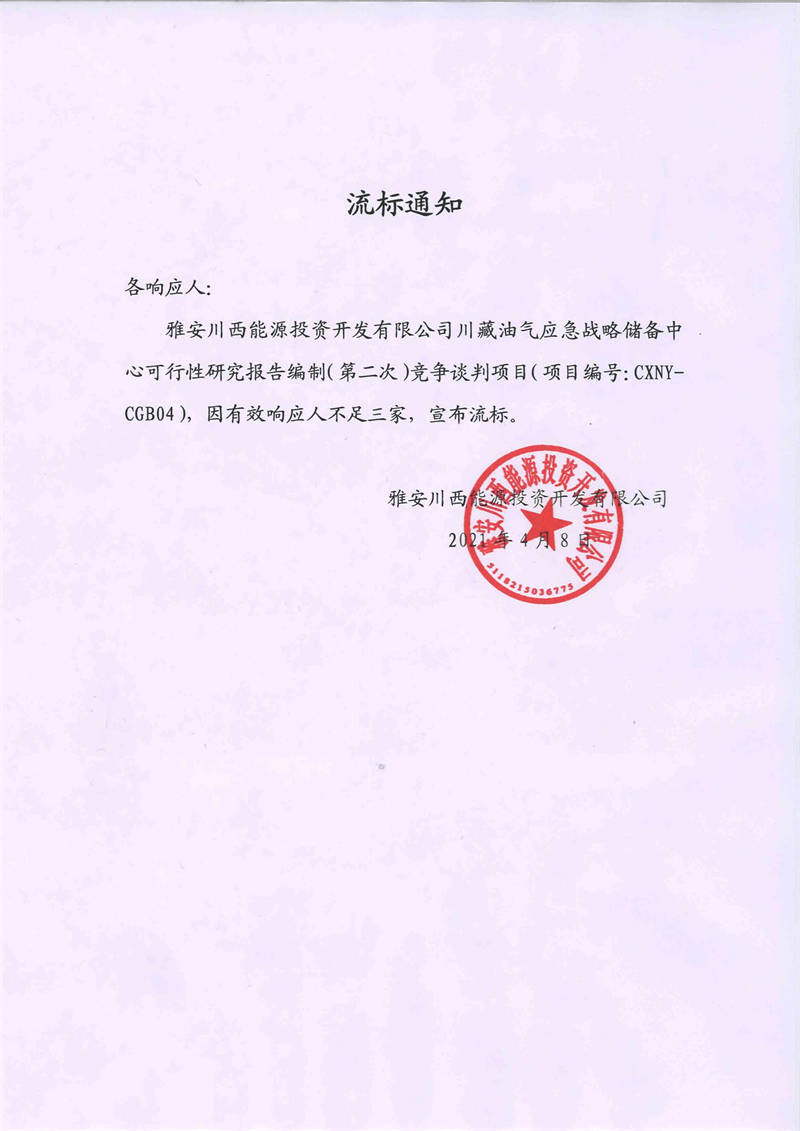 雅安川西能源投資開發(fā)有限公司川藏油氣應急戰(zhàn)略儲備中心可行性研究報告編制(第二次)競爭談判項目流標通知