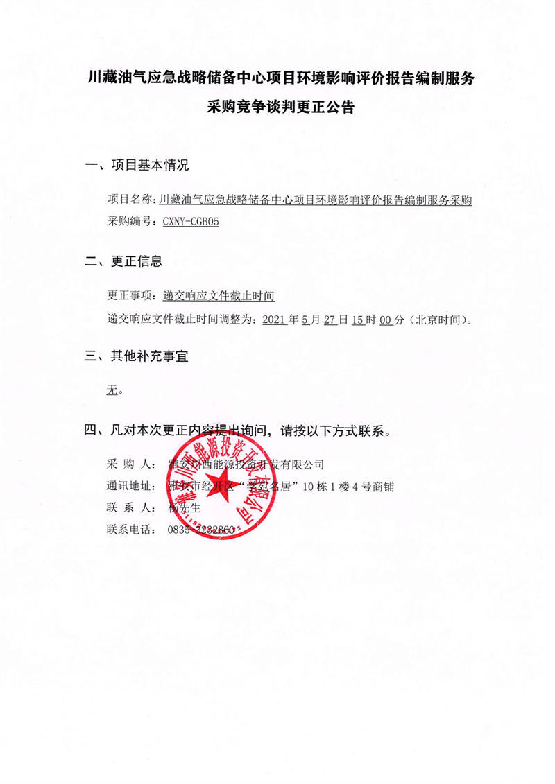 雅安川西能源投資開發(fā)有限公司川藏油氣應急戰(zhàn)略儲備中心項目環(huán)境影響評價報告編制服務采購競爭談判更正公告