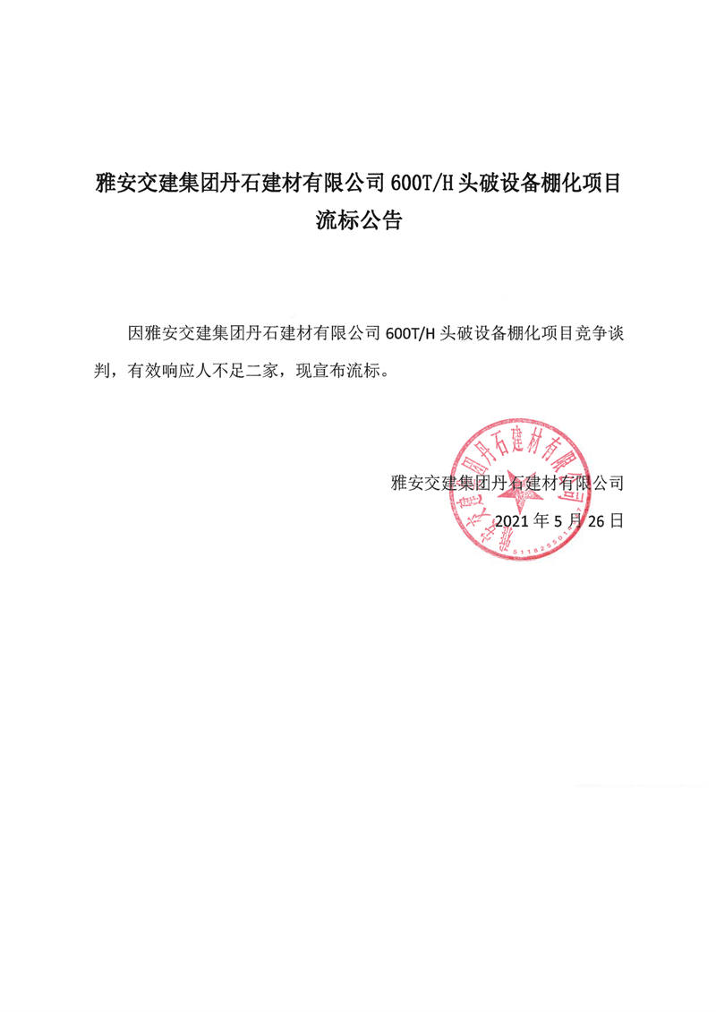 雅安交建集團丹石建材有限公司600T/H頭破設(shè)備棚化項目流標公告