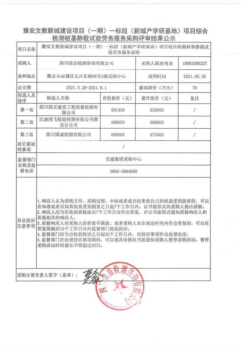 四川佳岳檢測(cè)咨詢(xún)有限公司雅安文教新城建設(shè)項(xiàng)目(一期)一標(biāo)段(新城產(chǎn)學(xué)研基地)項(xiàng)目綜合檢測(cè)樁基靜載試驗(yàn)勞務(wù)服務(wù)采購(gòu)評(píng)審結(jié)果公示