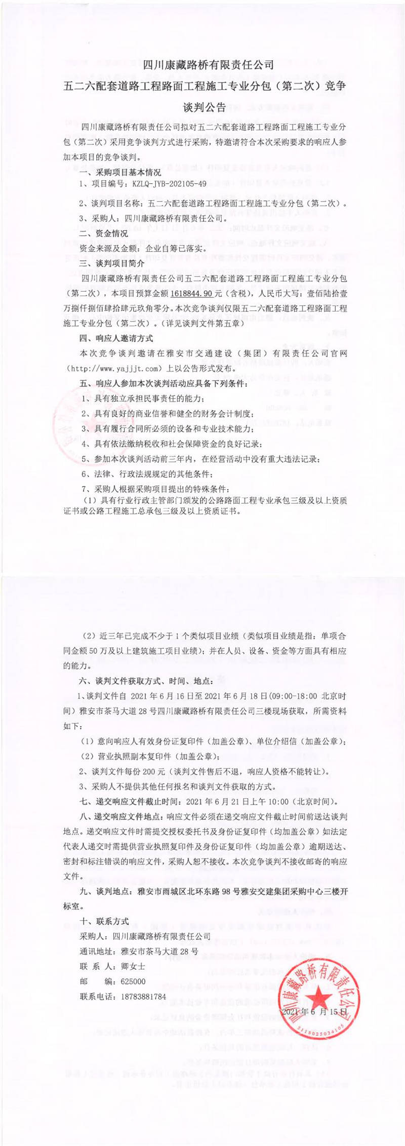 四川康藏路橋有限責(zé)任公司五二六配套道路工程路面工程施工專業(yè)分包(第二次)競爭談判公告