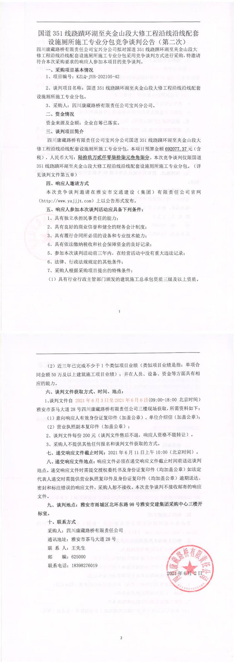 四川康藏路橋有限責(zé)任公司寶興分公司國(guó)道351線蹺磧環(huán)湖至夾金山段大修工程沿線沿線配套設(shè)施廁所施工專業(yè)分包競(jìng)爭(zhēng)談判公告(第二次)