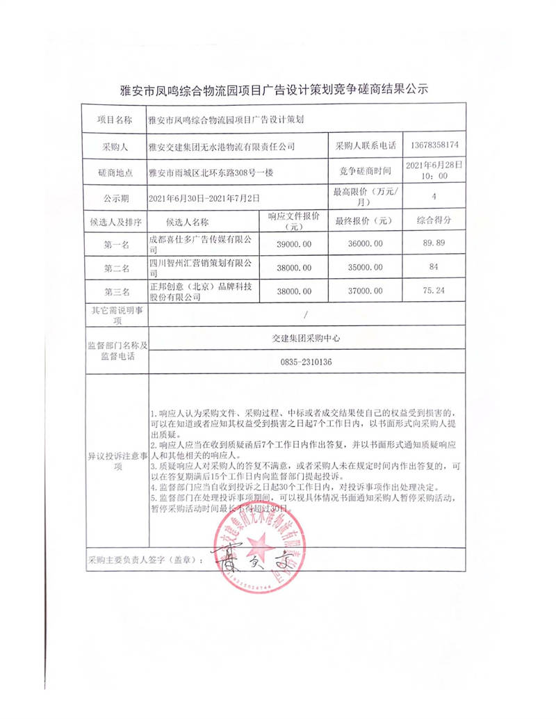 雅安交建集團無水港物流有限責任公司雅安市鳳鳴綜合物流園項目廣告設計策劃競爭磋商結果公示