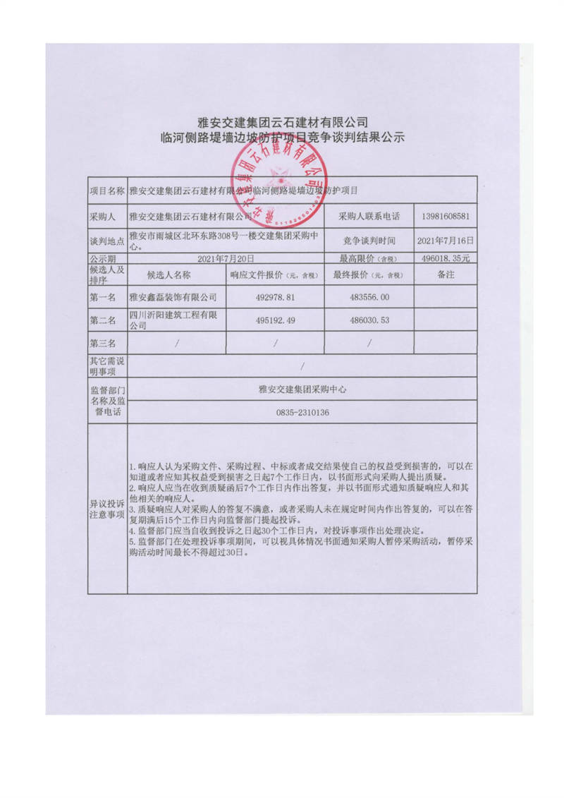 雅安交建集團云石建材有限公司臨河側(cè)路堤墻邊坡防護項目競爭談判結(jié)果公示