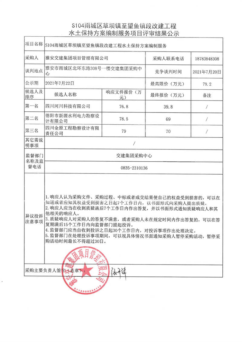 雅安交建集團(tuán)項(xiàng)目管理有限公司S104雨城區(qū)草壩鎮(zhèn)至望魚鎮(zhèn)段改建工程水土保持方案編制服務(wù)項(xiàng)目評(píng)審結(jié)果公示