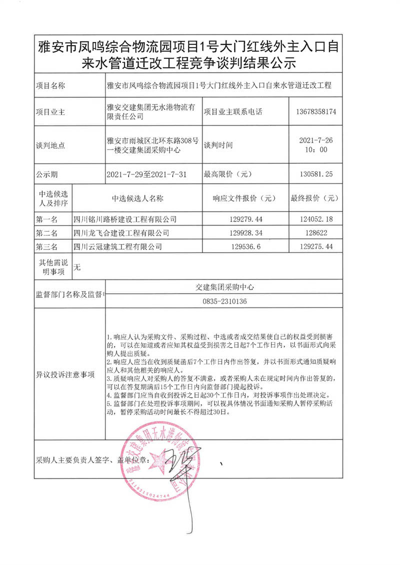 雅安交建集團(tuán)無(wú)水港物流有限責(zé)任公司雅安市鳳鳴綜合物流園項(xiàng)目1號(hào)大門(mén)紅線外主入口自來(lái)水管道遷改工程競(jìng)爭(zhēng)談判結(jié)果公示