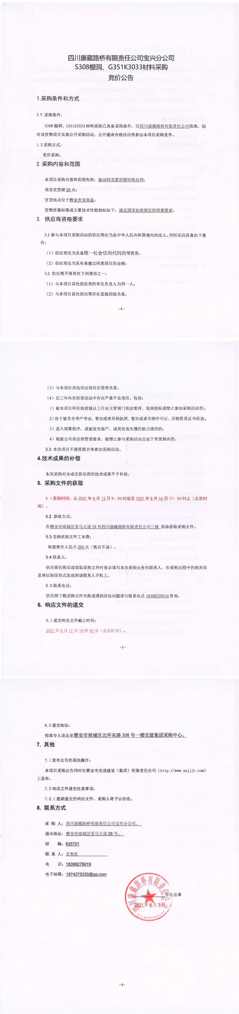 四川康藏路橋有限責(zé)任公司寶興分公司S308棚洞、G351K3033材料采購競價(jià)公告
