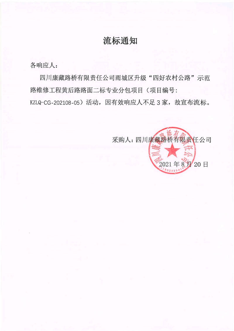 四川康藏路橋有限責任公司雨城區(qū)升級“四好農村公路”示范路維修工程黃后路路面二標專業(yè)分包項目流標通知