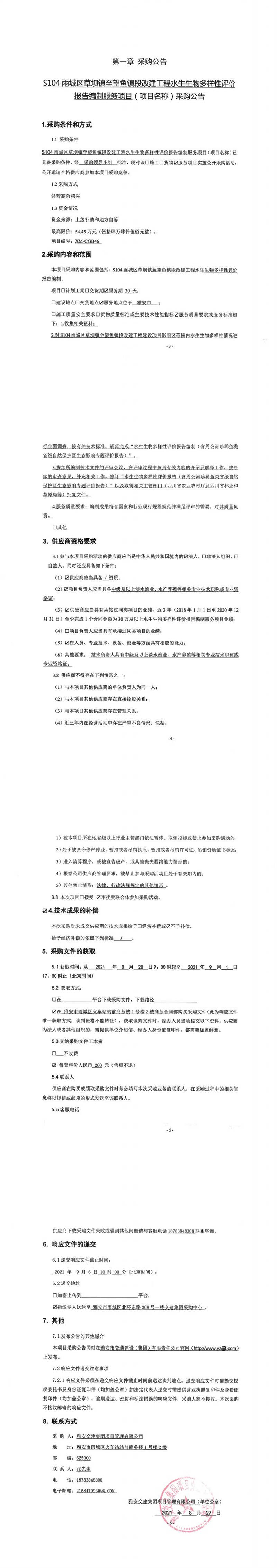 雅安交建集團(tuán)項(xiàng)目管理有限公司S104雨城區(qū)草壩鎮(zhèn)至望魚鎮(zhèn)段改建工程水生生物多樣性評(píng)價(jià)報(bào)告編制服務(wù)項(xiàng)目采購(gòu)公告