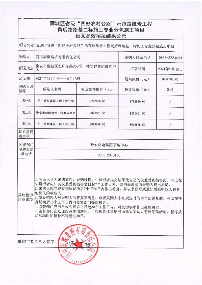 四川康藏路橋有限責(zé)任公司雨城區(qū)省級“四好農(nóng)村公路”示范路維修工程黃后路路基二標(biāo)施工專業(yè)分包施工項目經(jīng)營高效招采結(jié)果公示