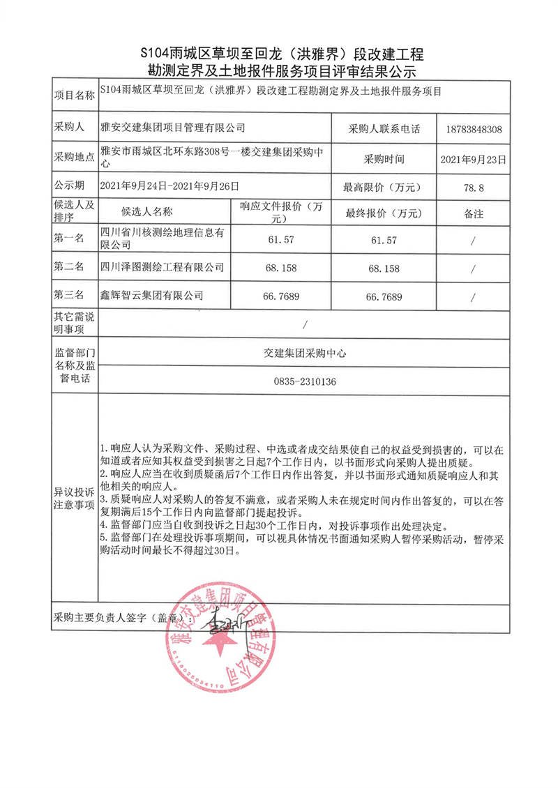 雅安交建集團(tuán)項(xiàng)目管理有限公司S104雨城區(qū)草壩至回龍(洪雅界)段改建工程勘測定界及土地報(bào)件服務(wù)項(xiàng)目評審結(jié)果公示