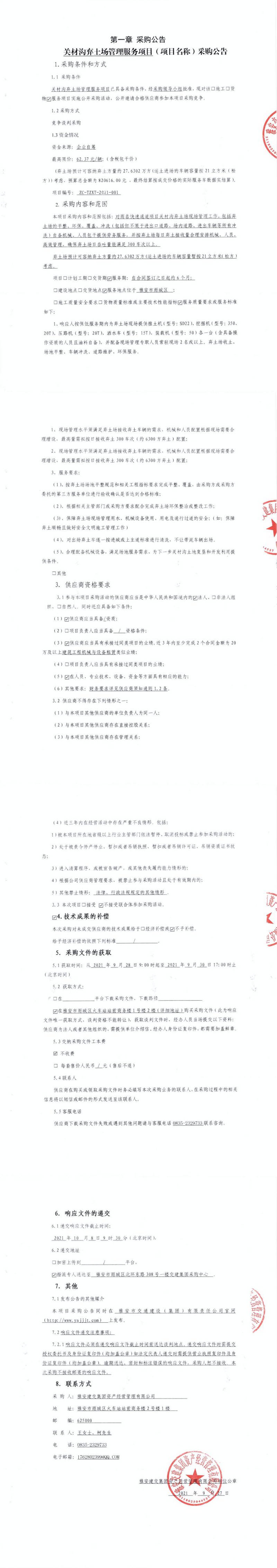 雅安交建集團資產經營管理有限公司關材溝棄土場管理服務項目采購公告