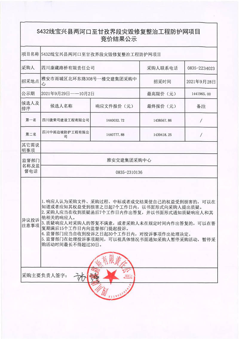 四川康藏路橋有限責任公司S432線寶興縣兩河口至甘孜界段災毀修復整治工程防護網(wǎng)項目競價結(jié)果公示