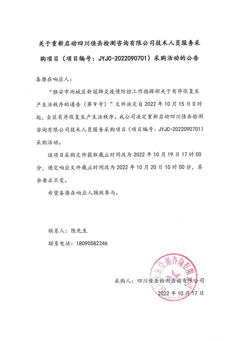 四川佳岳檢測咨詢有限公司關(guān)于重新啟動四川佳岳檢測咨詢有限公司技術(shù)人員服務(wù)采購項目(項目編號:JYJC-2022090701)采購活動的公告