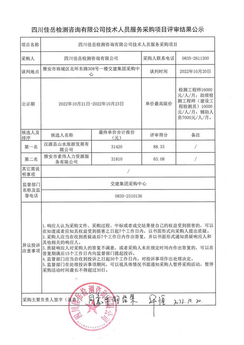 四川佳岳檢測(cè)咨詢(xún)有限公司技術(shù)人員服務(wù)采購(gòu)項(xiàng)目評(píng)審結(jié)果公示