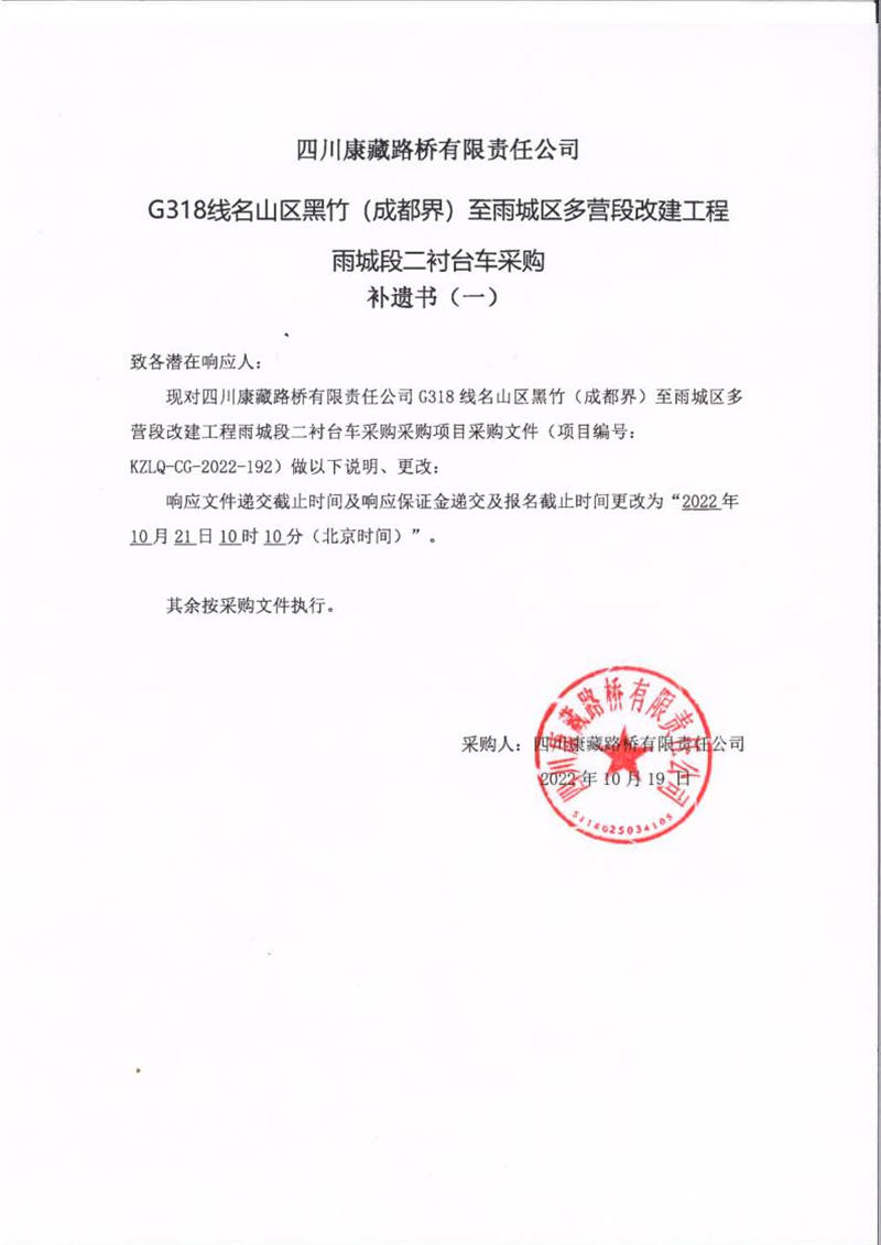 四川康藏路橋有限責(zé)任公司G318線名山區(qū)黑竹(成都界)至雨城區(qū)多營段改建工程雨城段二襯臺(tái)車采購補(bǔ)遺書(一)