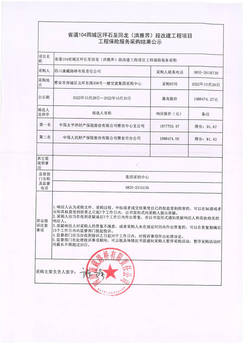四川康藏路橋有限責(zé)任公司省道104雨城區(qū)坪石至回龍(洪雅界)段改建工程項(xiàng)目工程保險服務(wù)采購結(jié)果公示